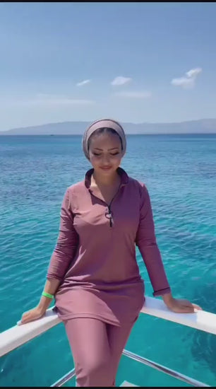 Elegant burkini-model met sportieve witte streepdetaillering en een fijne, subtiele riem in de taille. Dankzij het verborgen knoopsysteem blijft de jurk op zijn plaats in het water. Inclusief bijpassende turban voor een stijlvolle look.