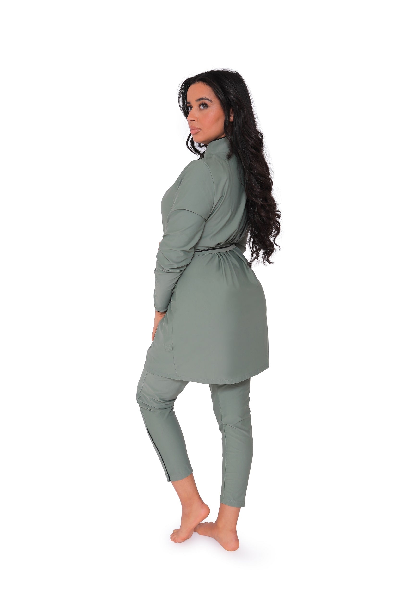 De set bestaat uit 4 delen: zwemtop met riem, turban en een zwemlegging.