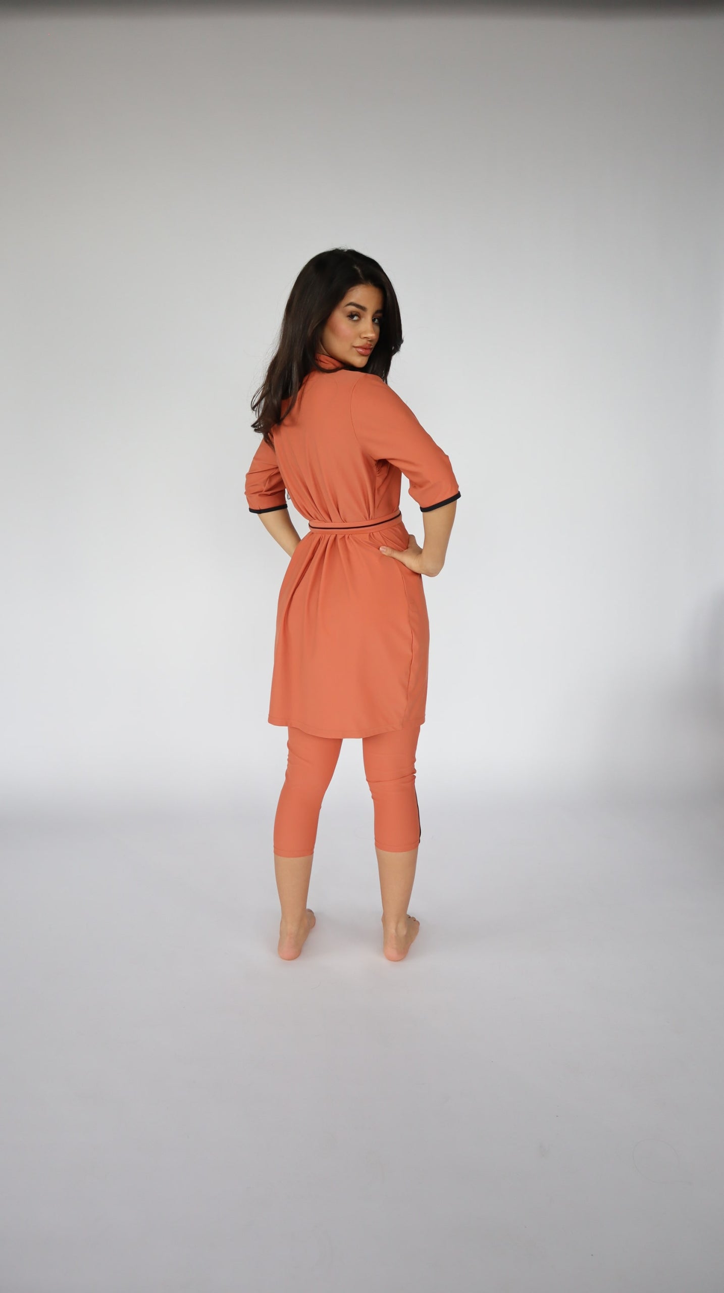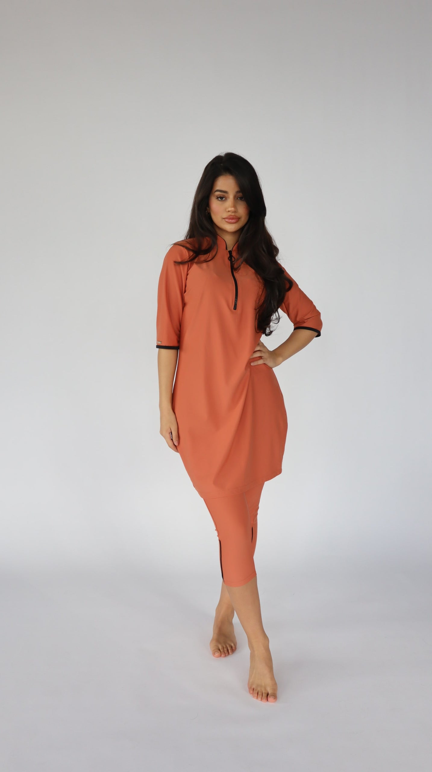 Dit sportieve model valt op door de subtiele witte strepen en een verfijnde tailleceintuur. De hooggesloten halslijn met ritssluiting voegt een moderne touch toe. Het verborgen knoopsysteem blijft de tuniek netjes op zijn plaats in het water.