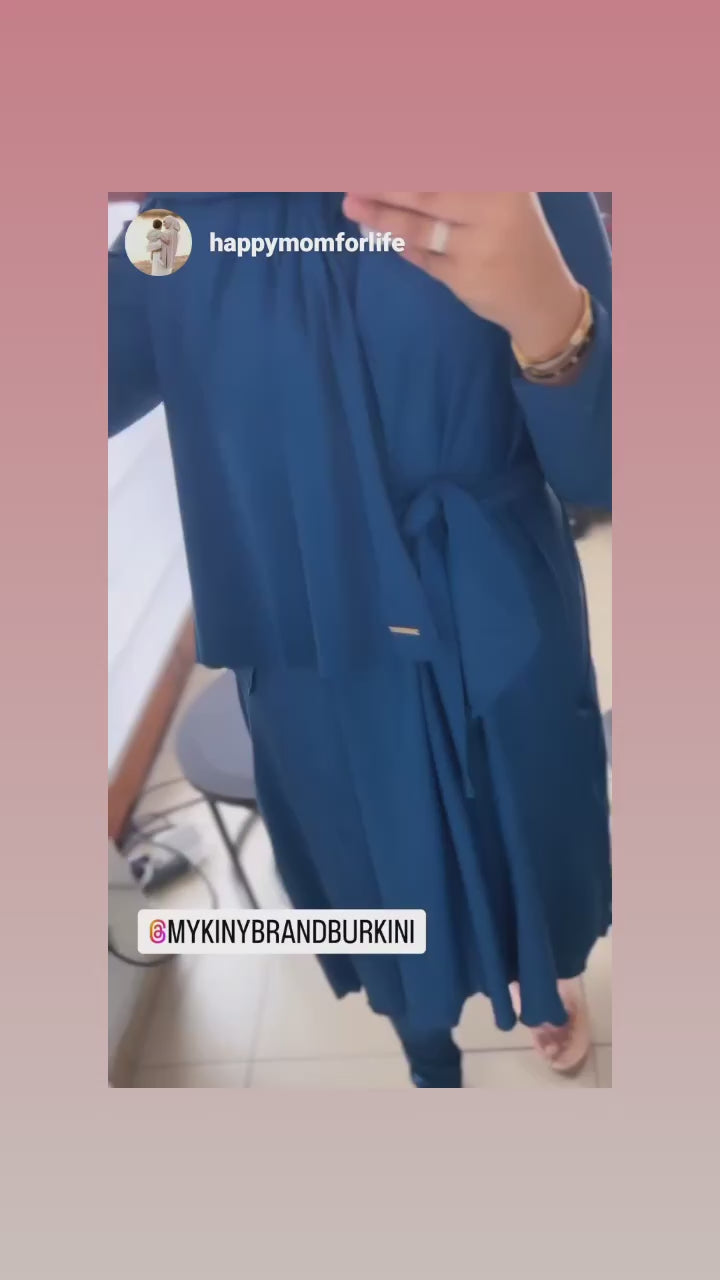 De Saffier tuniek jurk met een vrouwelijke sjerp in de taille biedt het perfecte silhouet. Met het verborgen knoop systeem blijft de jurk in het water netjes op zijn plaats. Inclusief een elegante hijab als finishing touch.