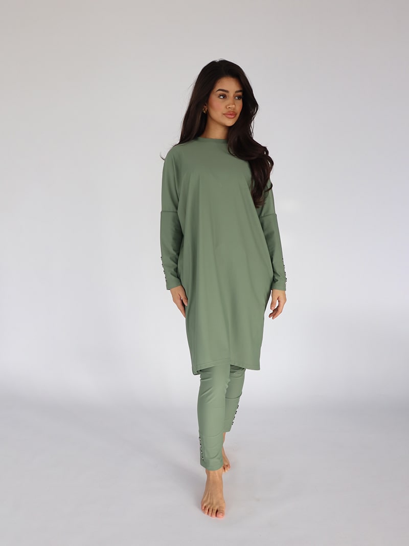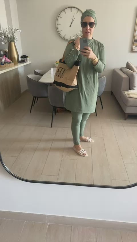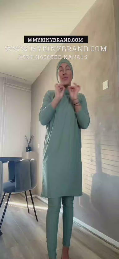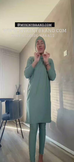 Oversized burkini met los vallende mouwen voor een flatterend silhouet is een combinatie van sportieve en casual stijl. Uitgerust met een verborgen knoopsysteem om de jurk op zijn plaats te houden. Set bevat een zwem tuniek, legging en turban.